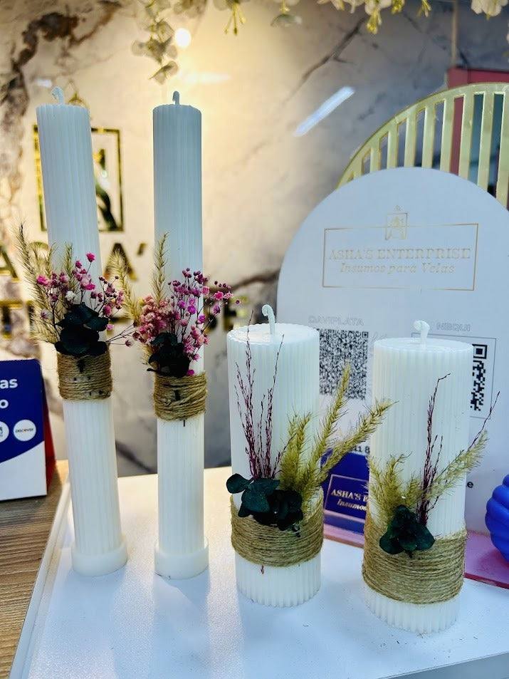 - Velas decorativas o aromáticas como complemento para mesas, ambientes o ceremonias.