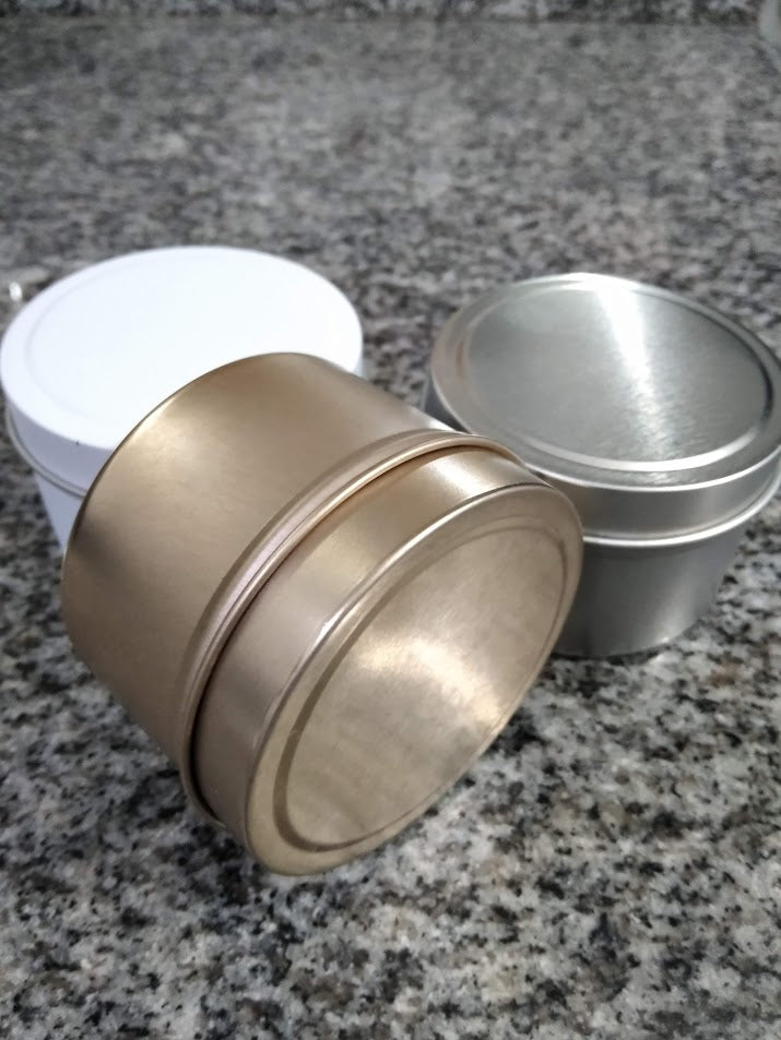 Envase de hojalata de lujo unicolor - Colores disponibles: Dorado, Blanco, Negro y Plateado - Medidas: 6.5 cm de diámetro x 4.5 cm de alto - Capacidad: 100 ml aprox.