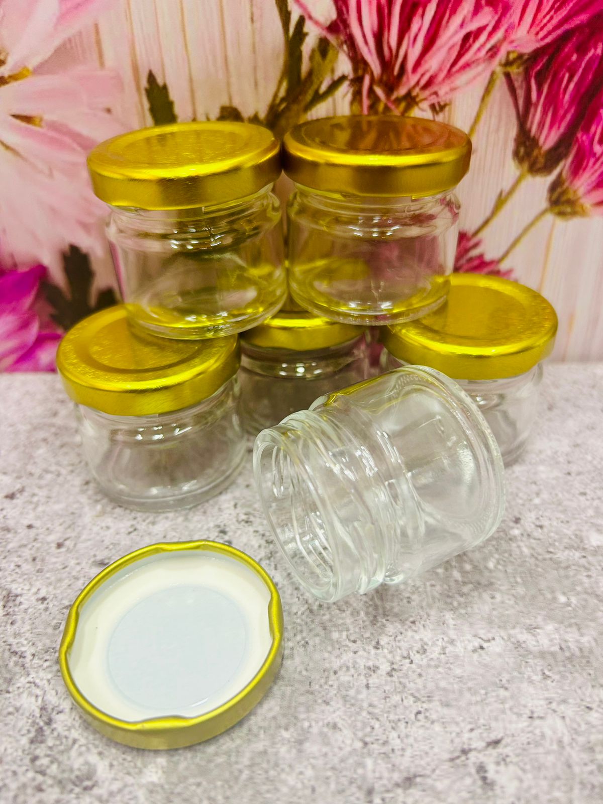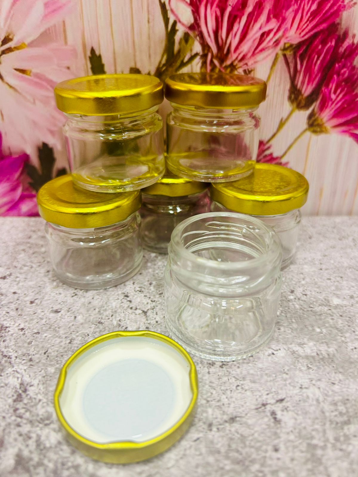 Agrega un toque de elegancia y refinamiento a tus productos con este hermoso envase de vidrio con tapa dorada.