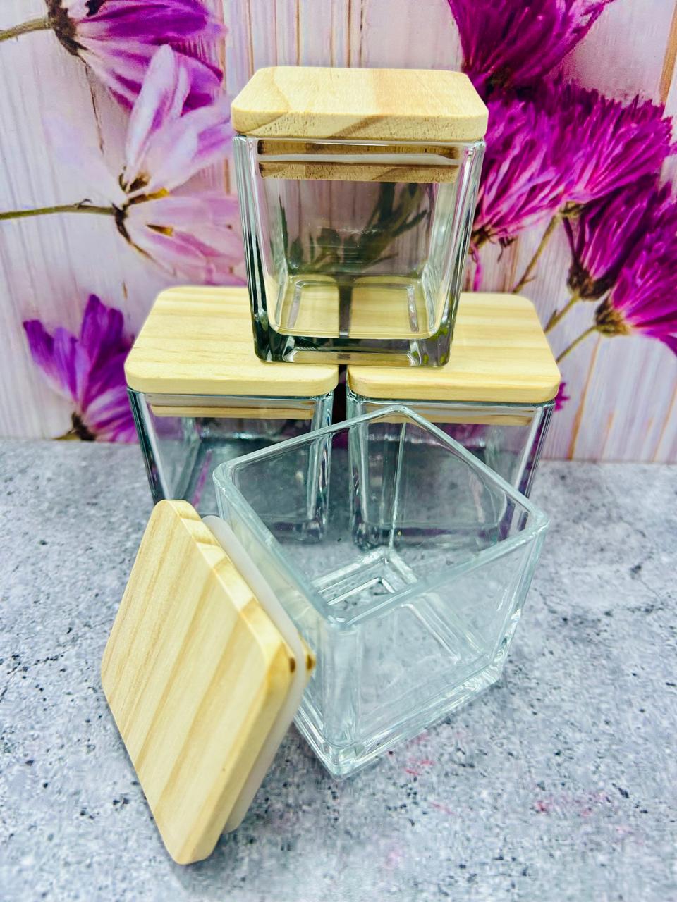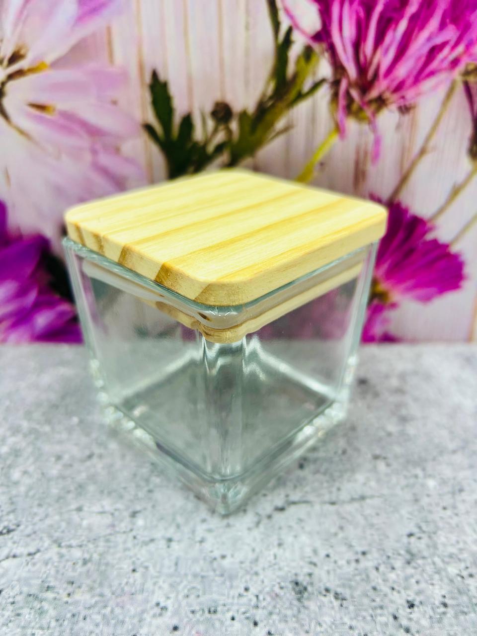 Un vaso de vidrio cuadrado y elegante con tapa de bambú, perfecto para pequeñas cantidades de productos.